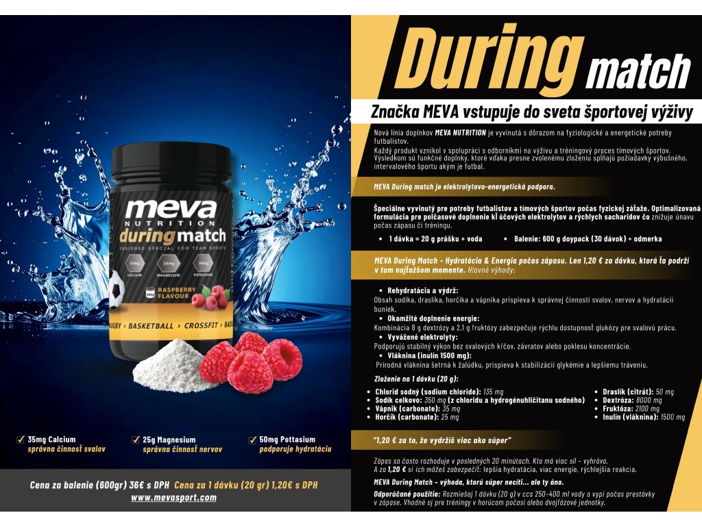 MEVA During match je elektrolytovo-energetická podpora. Špeciálne vyvinutý pre potreby futbalistov a tímových športov počas fyzickej záťaže. Optimalizovaná formulácia pre polčasové doplnenie kľúčových elektrolytov a rýchlych sacharidov čo znižuje únavu počas zápasu či tréningu.